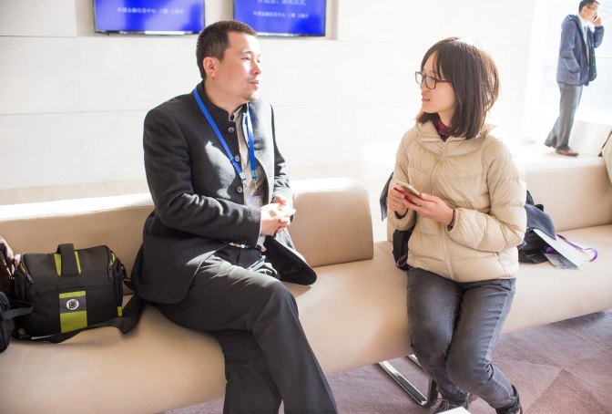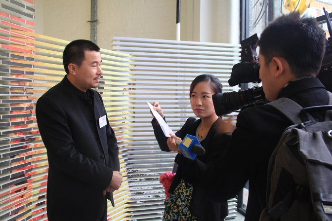 丁伟在场外接受记者的采访